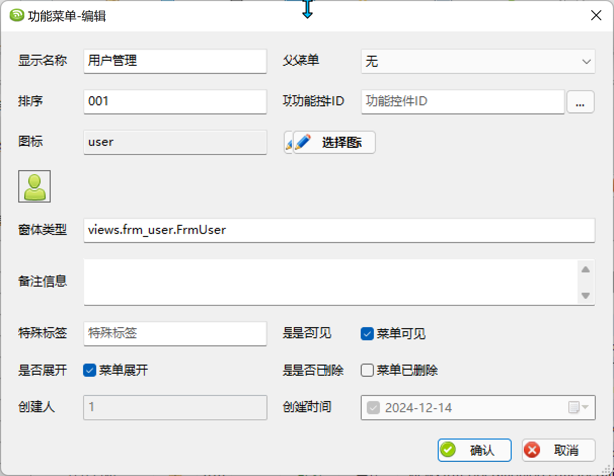 菜单信息,包括名称和相关的图标定义等,这些需要再前端界面中构建工具栏显示用到的资源,而窗体类型则是定义我们需要动态展示的菜单对象的模块名和类名称。