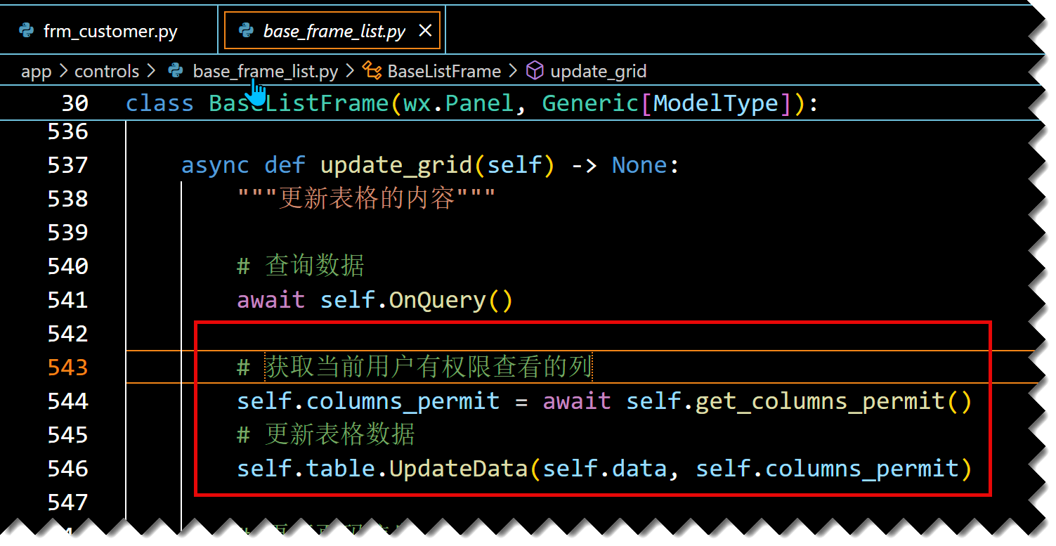 我们在基类窗体的类上,对更新表格数据的处理进行调整,增加对字段权限的获取,在传递给实际更新表格的接口即可,如下代码所示。