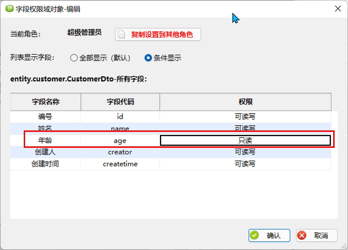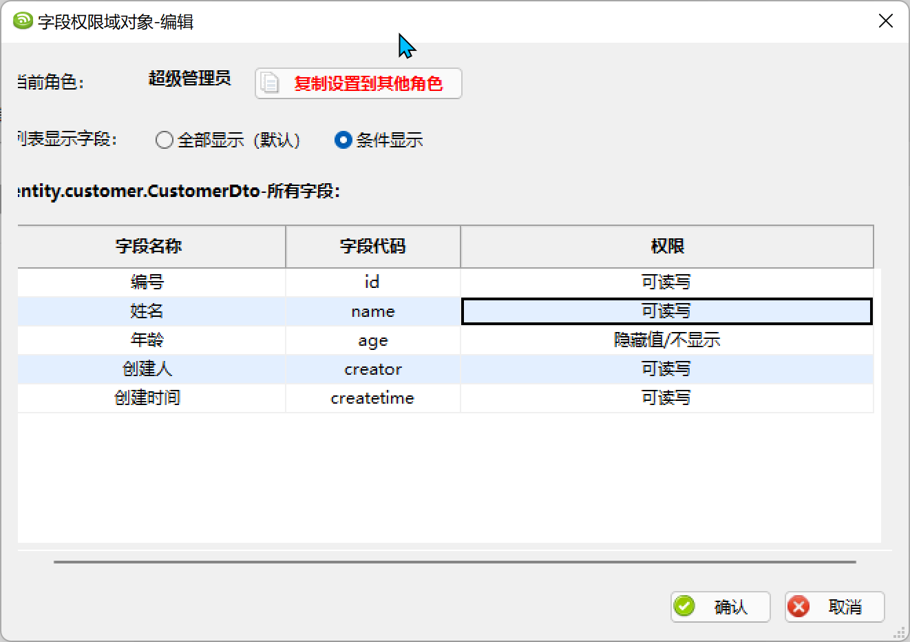 确认后,系统记录对应角色对业务模块中的相关字段的权限处理。