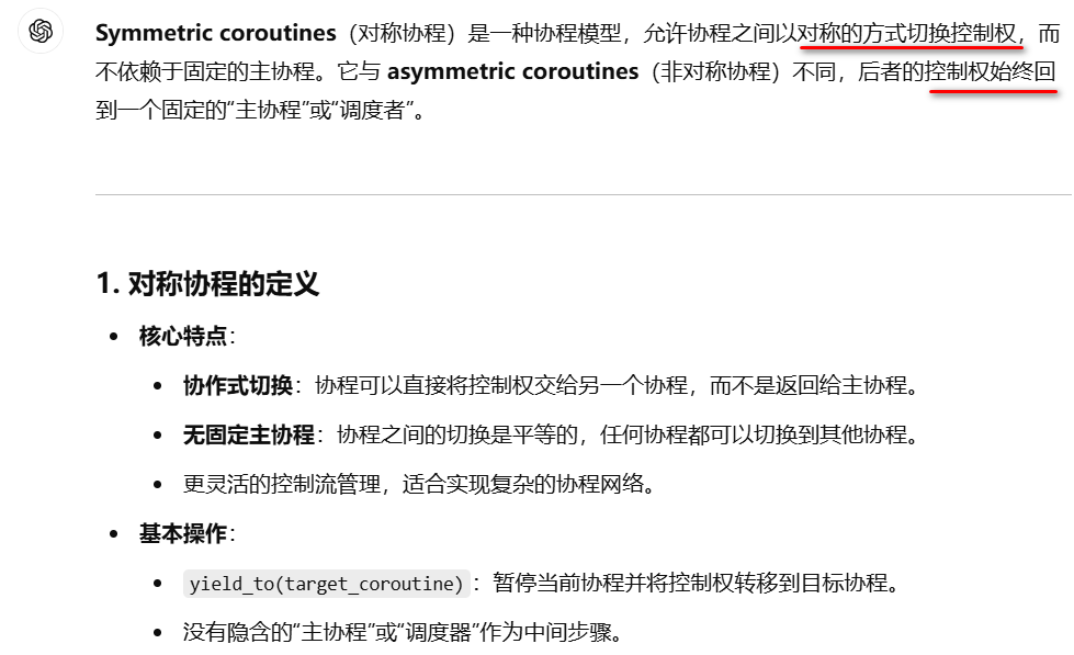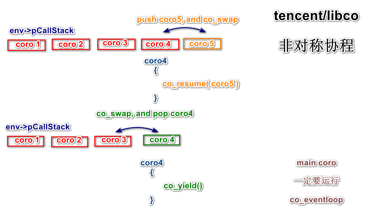 tencent则是实现成非对称协程,它使用了一个pCallStack[128]来支持128层的非对称协程调用。目的让对称协程有类似co_return跟co_await的能力。它让co_resume类似co_await,co_yield类似co_return。这样它co_resume就将自身coro作为一帧CallStack并push。co_yield则从pCallStack中pop一帧进行切换。这样就可以让你的coro使用co_resume好像在调用其它coro,并在其co_yiled时返回当前的coro。tencent它用了一个co_CoroutineFunc函数对coro函数进行保护,当coro函数在return返回时,会返回到co_CoroutineFunc,co_CoroutineFunc的结尾处co_yiled,确保这个coro函数的执行流最后是在co_yiled。