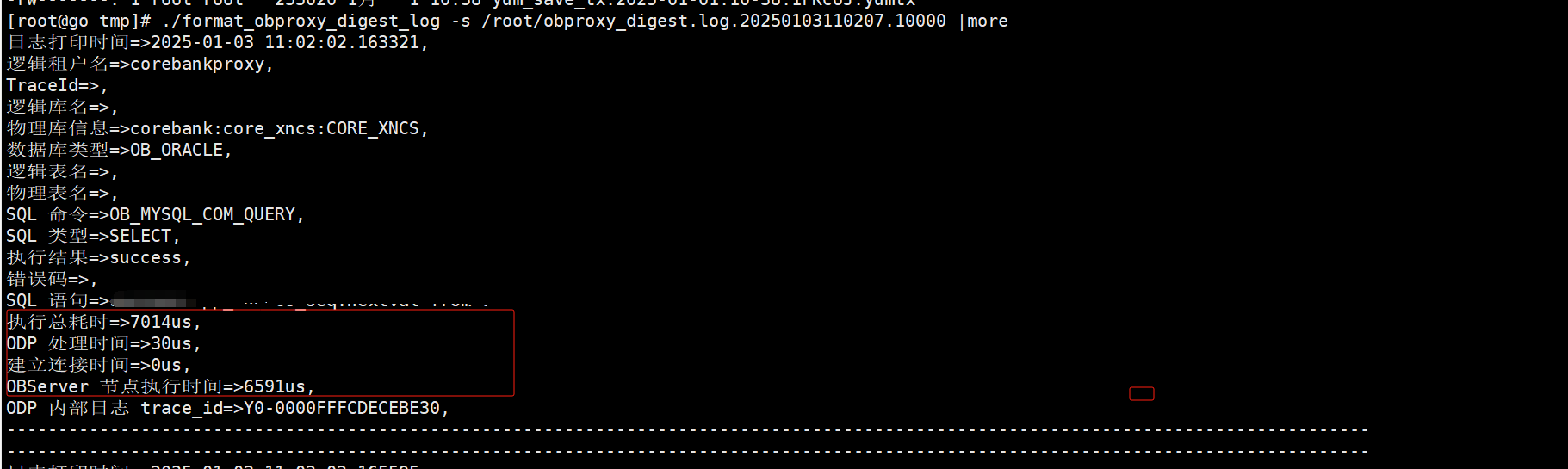 但是分析出服务端业务SQL语句执行时间还不够,应用也有可能会和你扯皮说obproxy转发慢,也不是不能查obproxy的日志来佐证,就日志里面的内容很难看,我经常懒得去看很烦,所以搞了个 format_obproxy_digest_log 工具来看proxy的转发耗时。