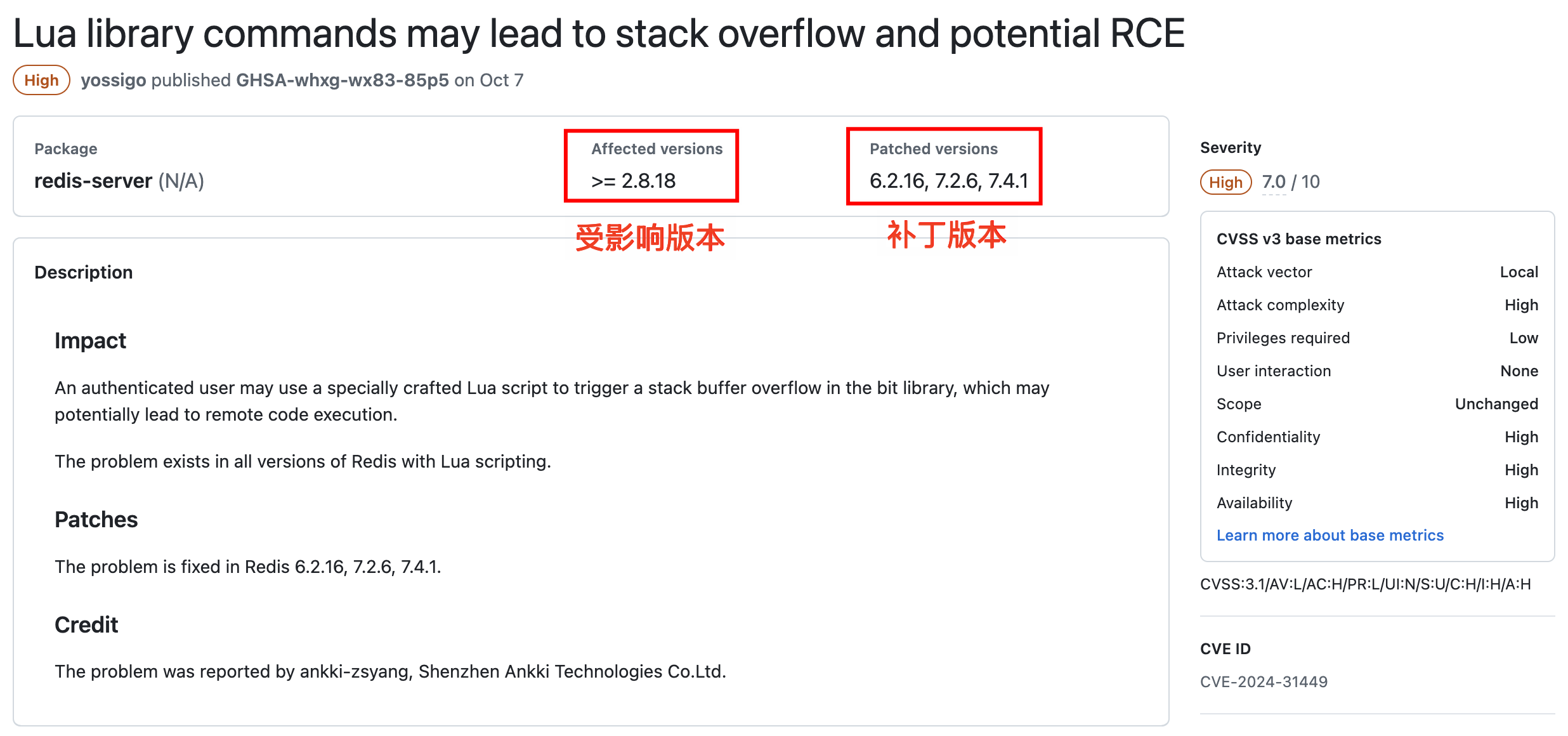 Redis 官方发布了 3 个漏洞补丁及修复版本:6.2.16, 7.2.6, 7.4.1,请评估业务是否受影响后,再酌情升级至安全版本,如果是 5.x 及以下的版本就不受支持了。