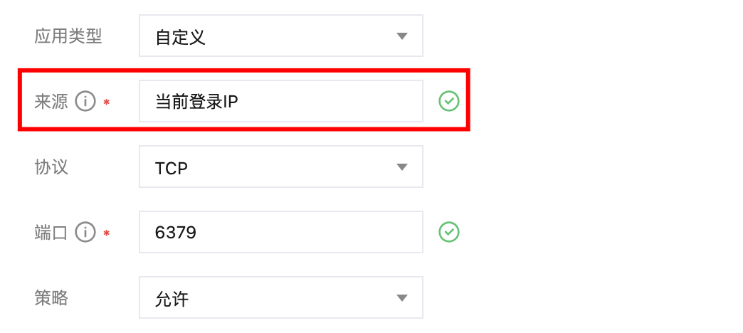 如果使用的是云服务,可以使用云上的安全组对 Redis 端口(默认:6379)设置只对指定的 IP 地址开放,如示例所示: