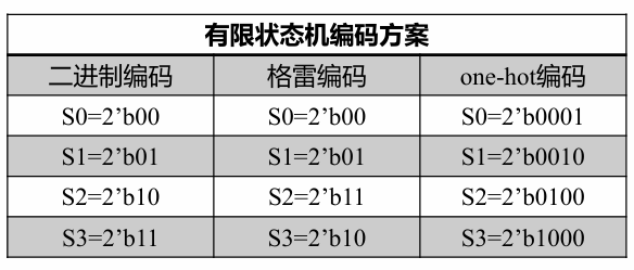 - 分析设计要求,列出状态机的所有状态,并对每一个状态进行状态编码