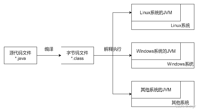 Java是跨平台的,它自带的Java虚拟机(Java Virtual Machine, JVM)可以很好地实现跨平台性。Java源程序代码经过编译后生成与平台无关的二进制代码,即字节码文件(.class文件),可被JVM中的Java解释器解释成所在具体平台上的机器指令,可以在装有JVM的任何平台上运行,从而实现 Java 与平台无关