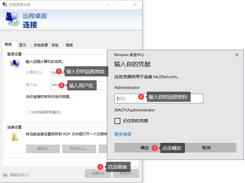 在弹出的凭据框中填写该用户的密码,点击确定即可连接。