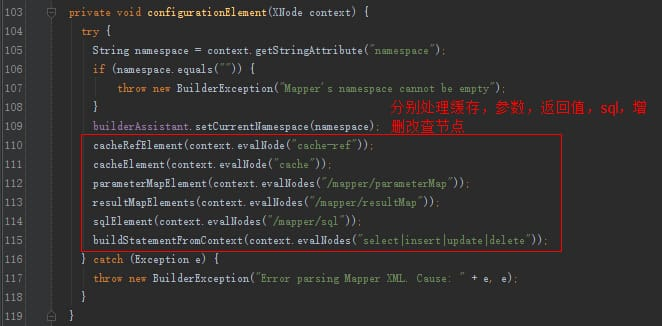 由于XMLConfigBuilder内部也是使用XMLMapperBuilder,我们就看看XMLMapperBuilder的解析细节: