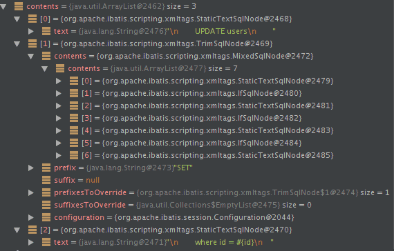 以上update方法最终通过parseDynamicTags方法得到的SqlNode集合如下:
