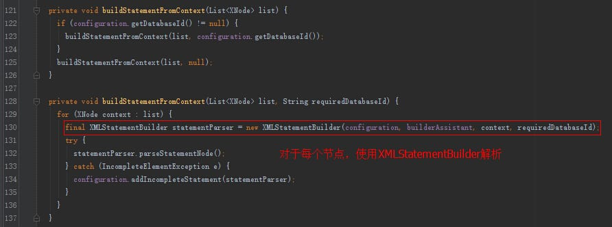 - XMLStatementBuilder:解析xml文件中各个节点,比如select,insert,update,delete节点,内部会使用XMLScriptBuilder处理节点的sql部分,遍历产生的数据会丢到Configuration的mappedStatements中。