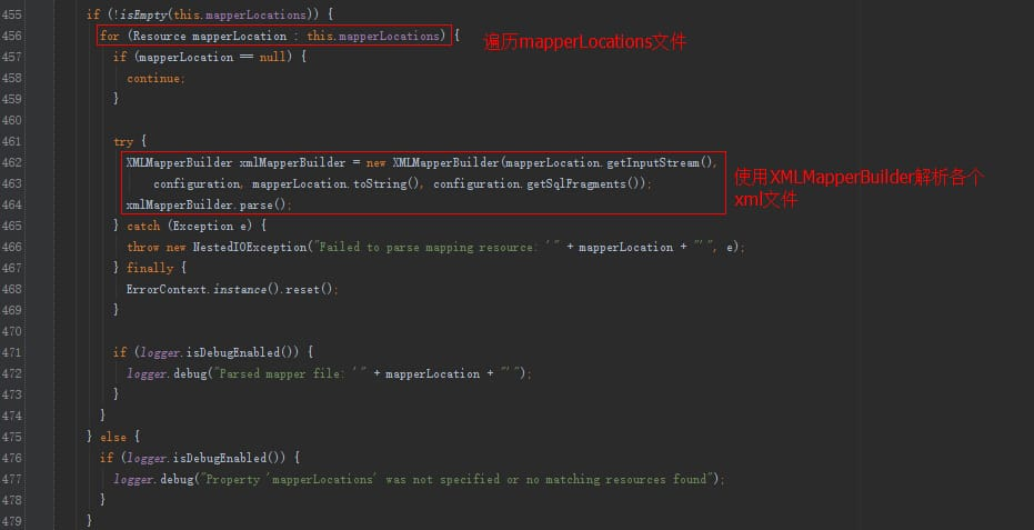 SqlSessionFactoryBean实现了Spring的InitializingBean接口,InitializingBean接口的afterPropertiesSet方法中会调用buildSqlSessionFactory方法 该方法内部会使用XMLConfigBuilder解析属性configLocation中配置的路径,还会使用XMLMapperBuilder属性解析mapperLocations属性中的各个xml文件。部分源码如下: