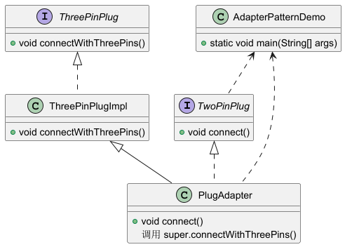 threePinPlug.connectWithThreePins(); // 转换三孔插头的接口为两孔插头接口