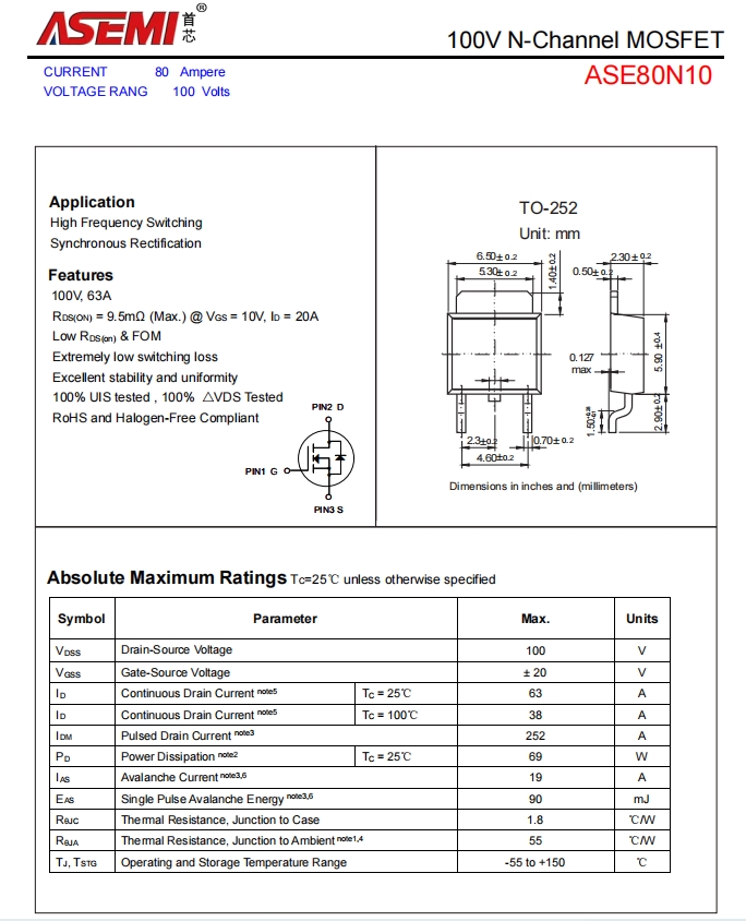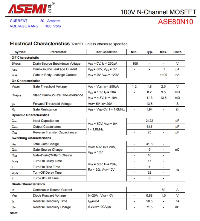ASE80N10具体参数为:最大漏源电流:80A,漏源击穿电压:100V,反向恢复时间: ns,封装:TO-252