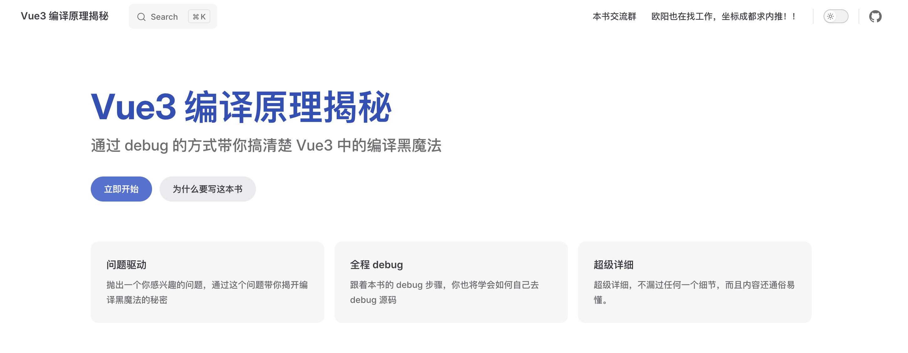 另外欧阳写了一本开源电子书vue3编译原理揭秘,看完这本书可以让你对vue编译的认知有质的提升。这本书初、中级前端能看懂,完全免费,只求一个star。
