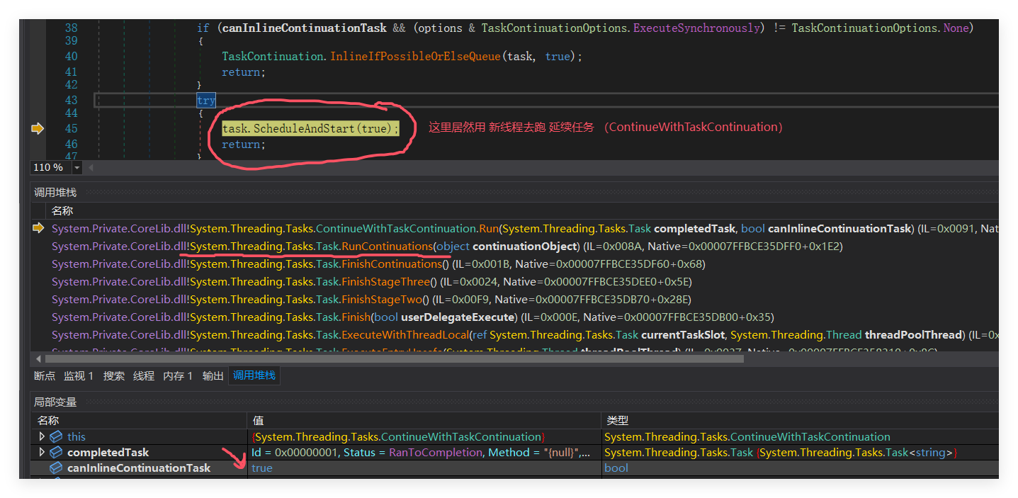 代码和模型图都有了,接下来就是用 dnspy 开干了。。。还是在 AddTaskContinuation 和 RunContinuations 上埋伏断点观察。