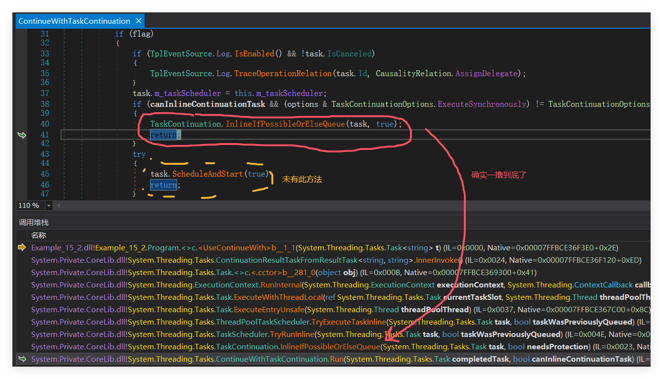 从卦中可以看到,延续任务使用新线程来执行的,并没有一撸到底,这明显与 asyncawait 的方式不同,有些朋友可能又要说了,那如何实现和StateMachine一样的呢?这就需要在 ContinueWith 中新增 ExecuteSynchronously 同步参数,参考如下: