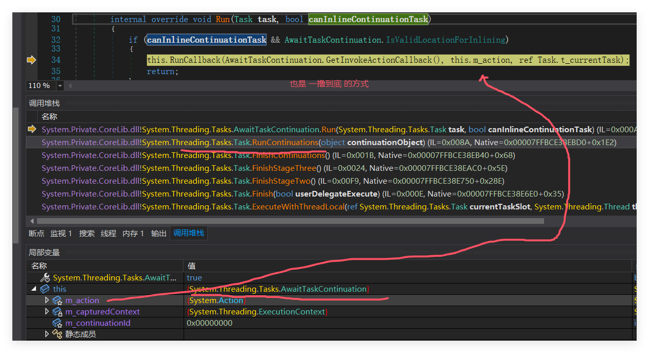这一小节我们单独说一下 RunContinuations 方法,因为这里的实现太精妙了,不幸的是Dnspy和ILSpy反编译出来的代码太狗血,原汁原味的简化后代码如下: