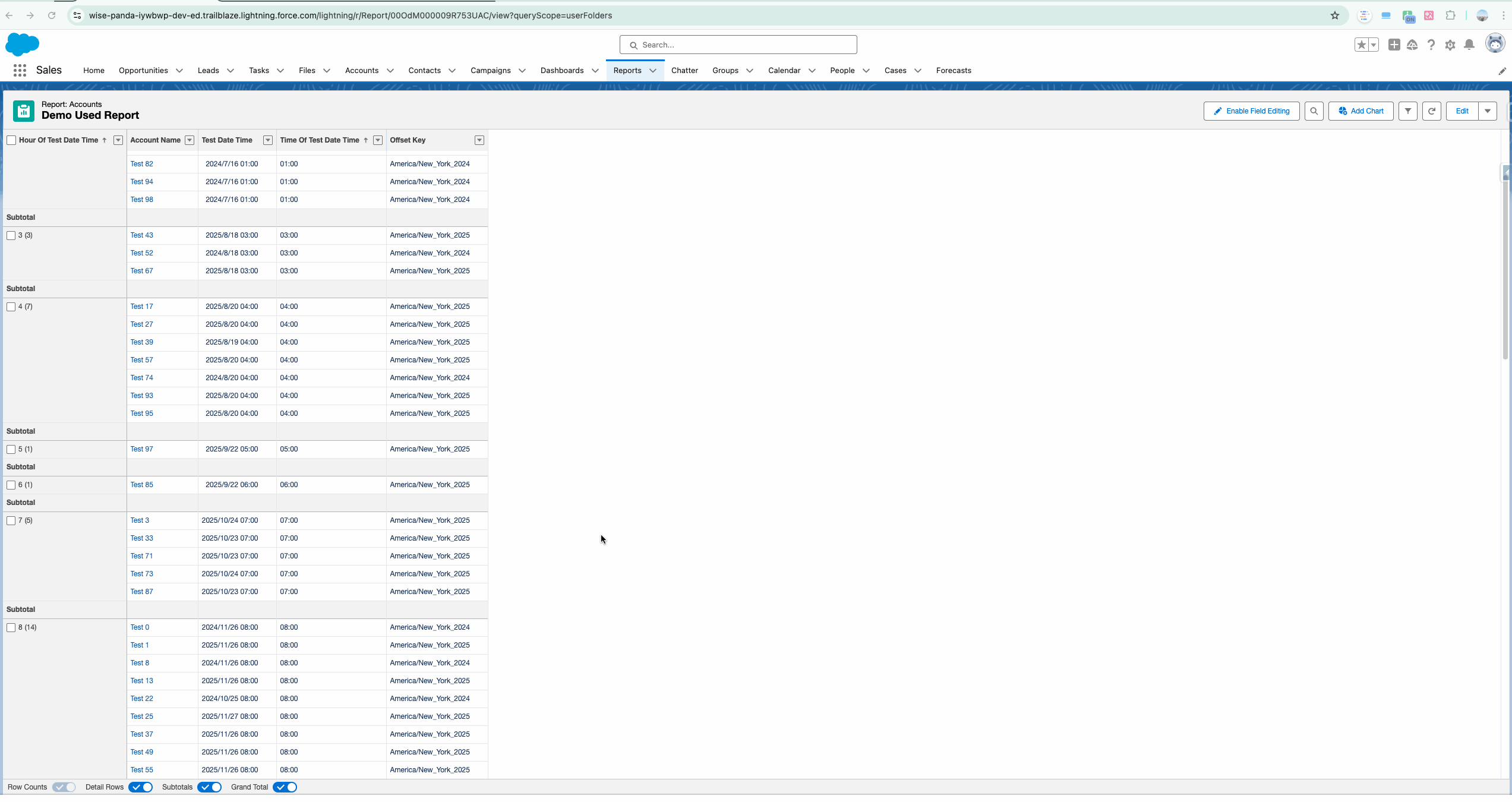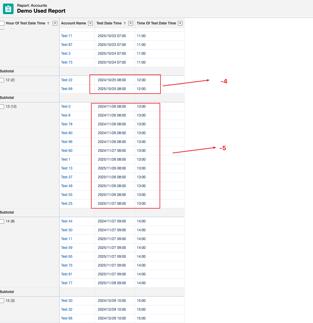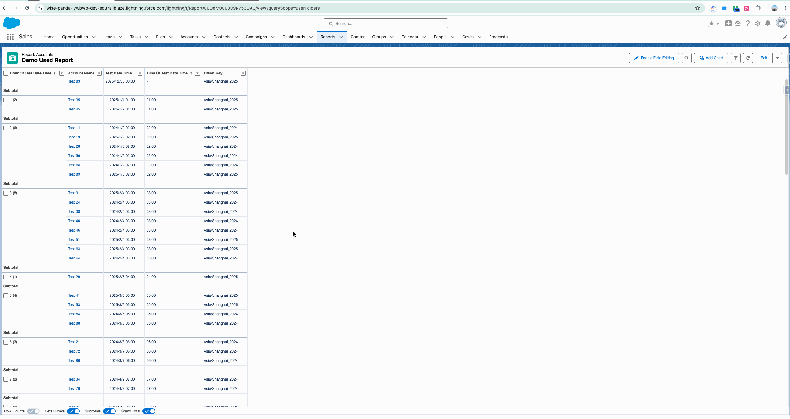 1. 通过GMT + 8中国账号演示效果,通过下方GIF我们可以看出 Test Date Time字段的Time信息 减去8小时即为 Time Of Test Date Time, Hour 和 Time 两个formula字段均显示GMT时间,8为当前user的locale time偏移量。