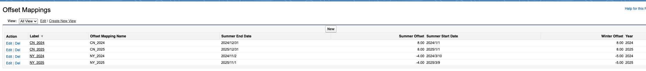 | 1-4个 | 包含 | 1-3年 | 创建 custom metadata,运行脚本设置timezone以及它对应的夏令时 start date 以及end date 以及冬夏的偏移量和年份,然后formula基于年份以及 start/end date去确认偏移量来动态展示。 |