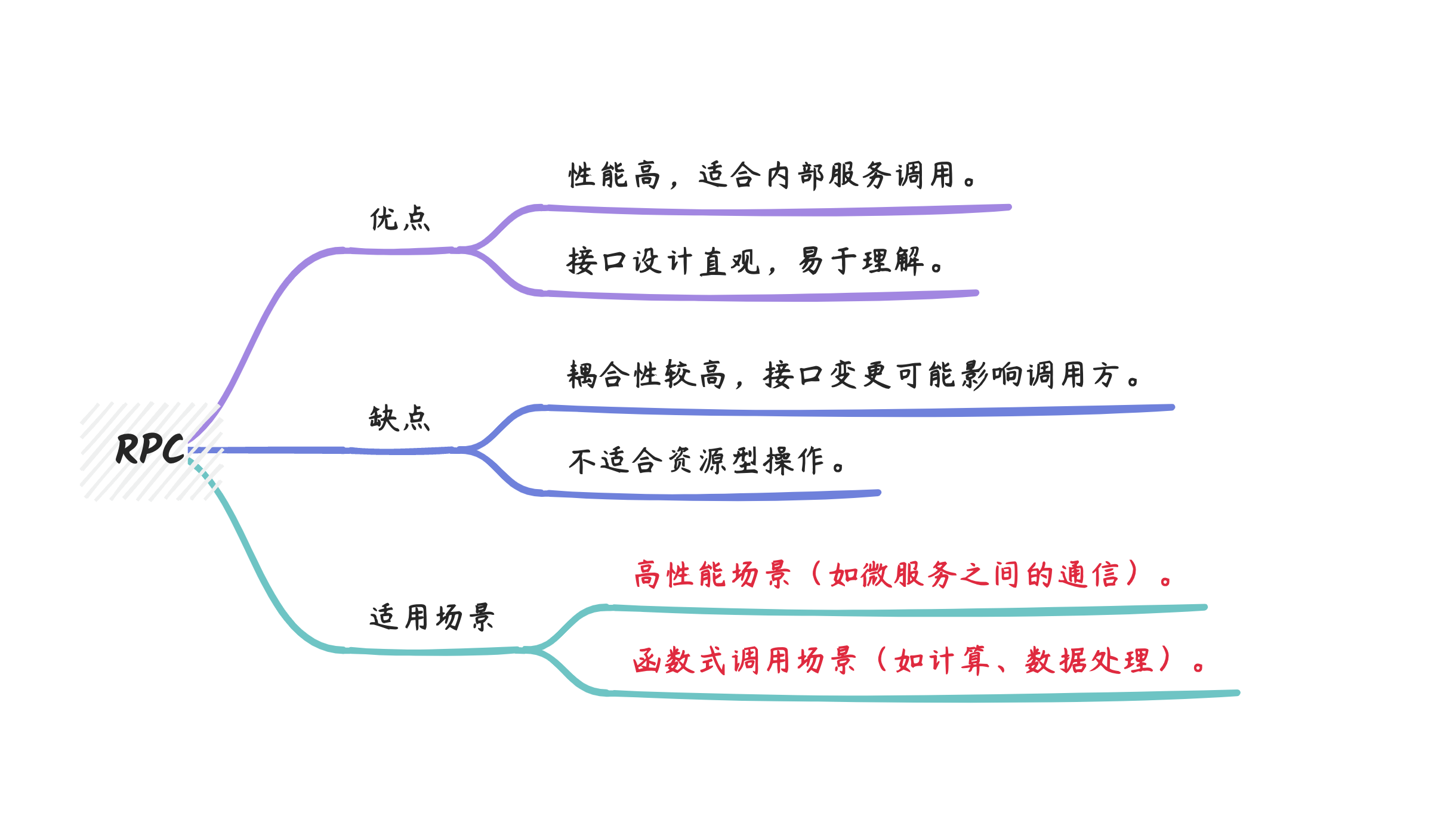RPC 是一种远程过程调用方式,通过调用远程函数来实现通信,通常基于 HTTP 或 TCP 协议。接口通常以动词命名,表示具体的操作。