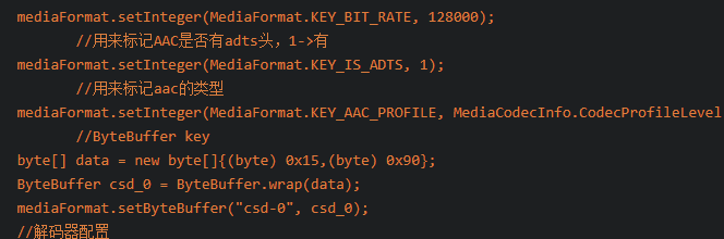 就是配置是否有ADTS头和csd_0数组的计算方式可以参考。然后就是这个128000,是说的波特率,表示录音硬件设备每秒发送128000个数据位给软件,8bit=1byte,可以计算一下每秒是上传15.625kb的数据。波特率越高,其android设备上的硬件上传数据的效率就越高。