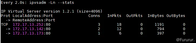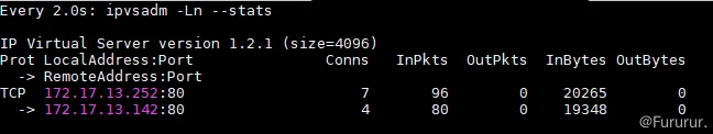 输入 watch ipvsadm -Ln --stats 可实时看到负载均衡的结果,正常。