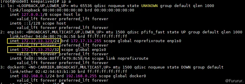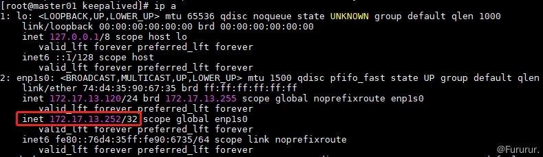 在 LB 的主节点上输入 ip a,可以看到 VIP 目前已经正确配置在网卡上。