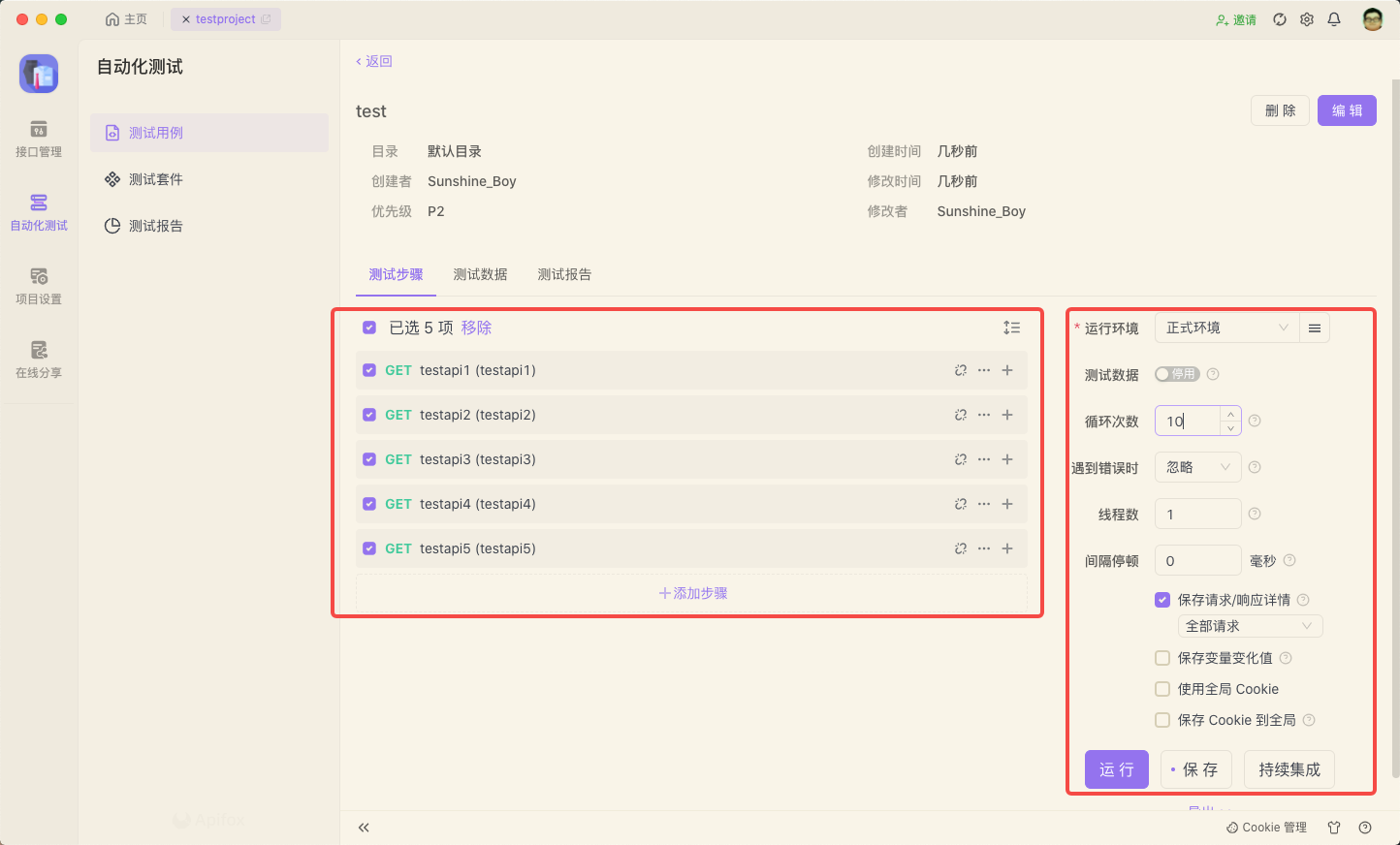 试想一下,如果有五个接口呢,不可能一个一个去发送吧~所以我们需要用到 Apifox 的自动化测试功能。