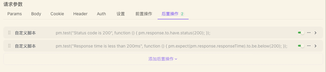 我们可以为这个请求设置多个测试校验,比如我这里加了两个: