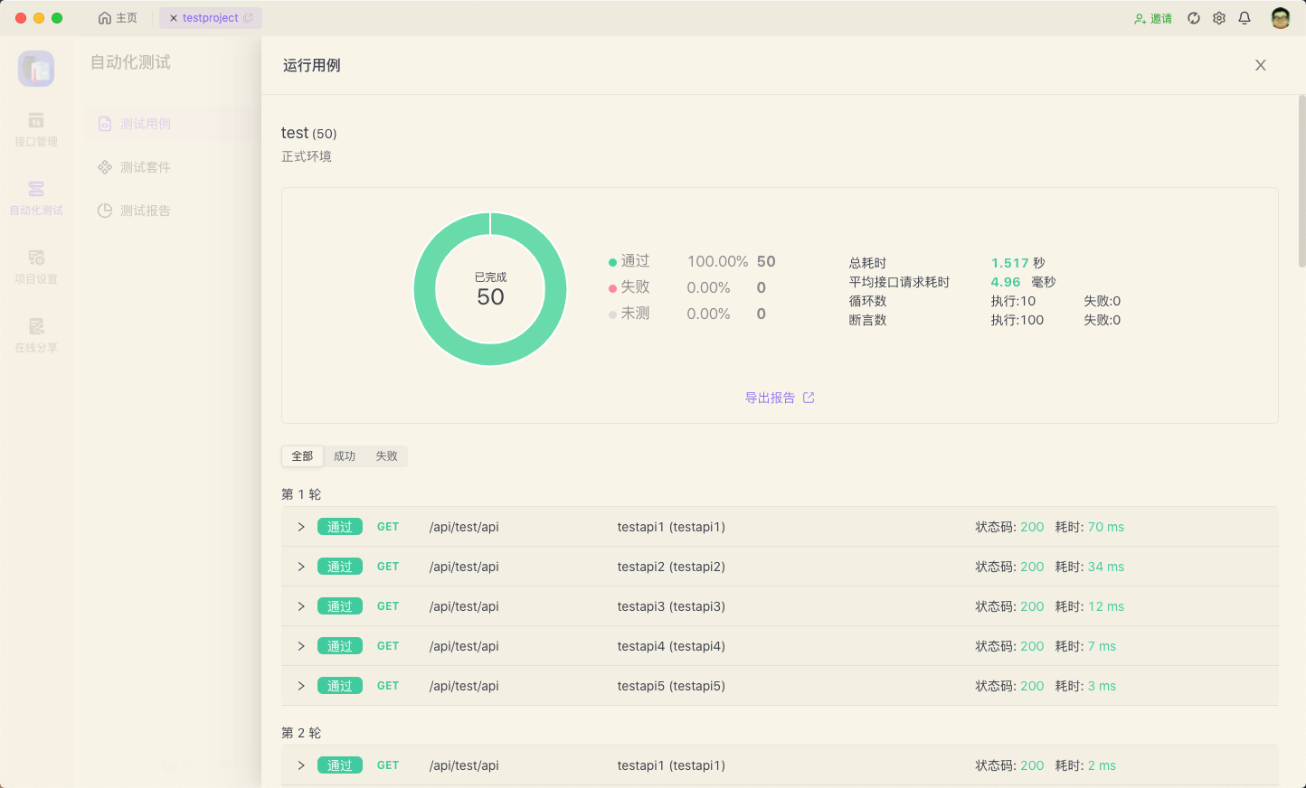 得出运行结果,可以查看耗时,成功数,失败数等报告参数。