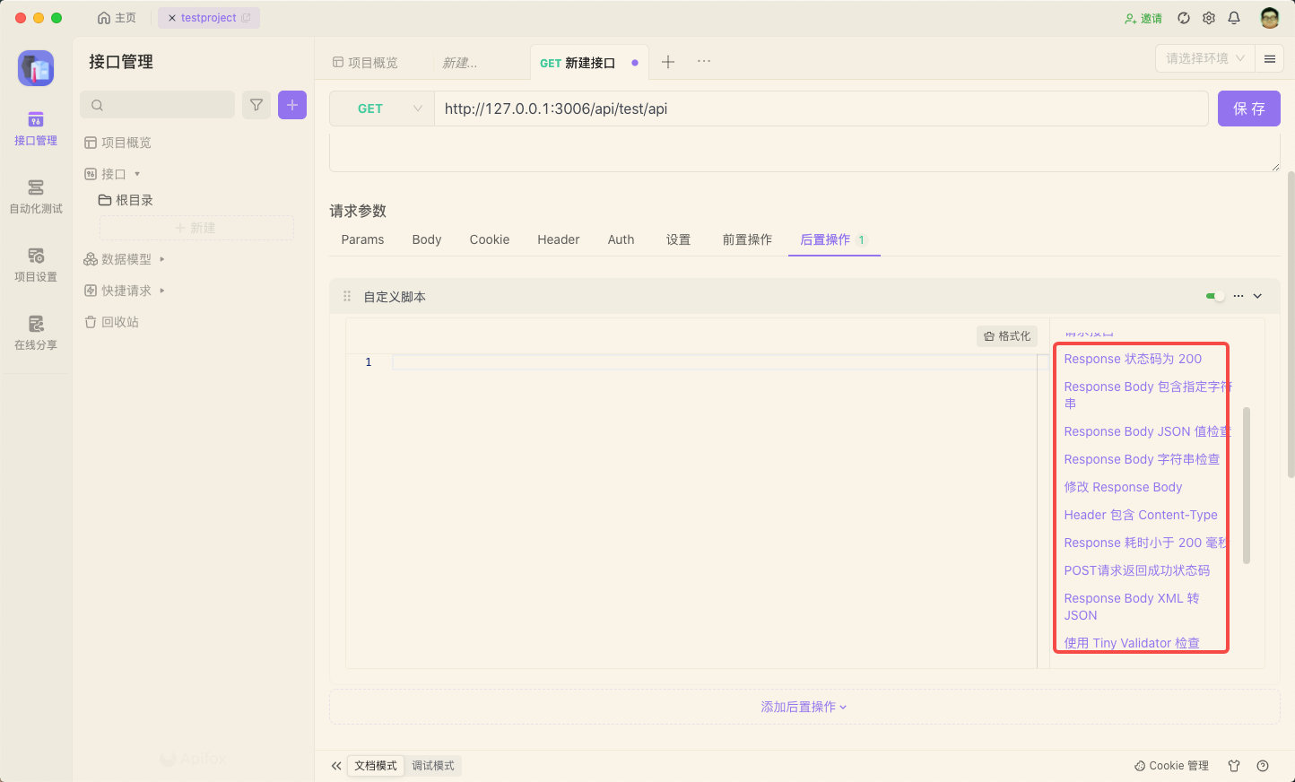 我们可以发现 Apifox 已经为我们准备了很多校验脚本代码的模板。