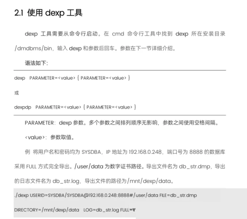 本来dexp是命令行的工具,在DM数据库SQL语句中并不能直接使用,但是DM提供了预定义的函数SF_START_EXE可以调用dexp