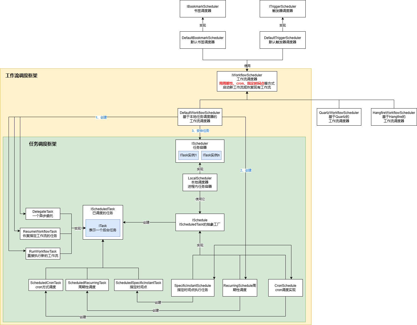 都是在后台安排工作流执行,可以用现有的三方框架来实现,比如:hangfire、quartz,本篇只讲elsa调度的执行原理,所以这两种实现不做分析,另外elsa也定义了默认实现DefaultWorkflowScheduler。它内部使用前面说的本地任务框架来安排任务。