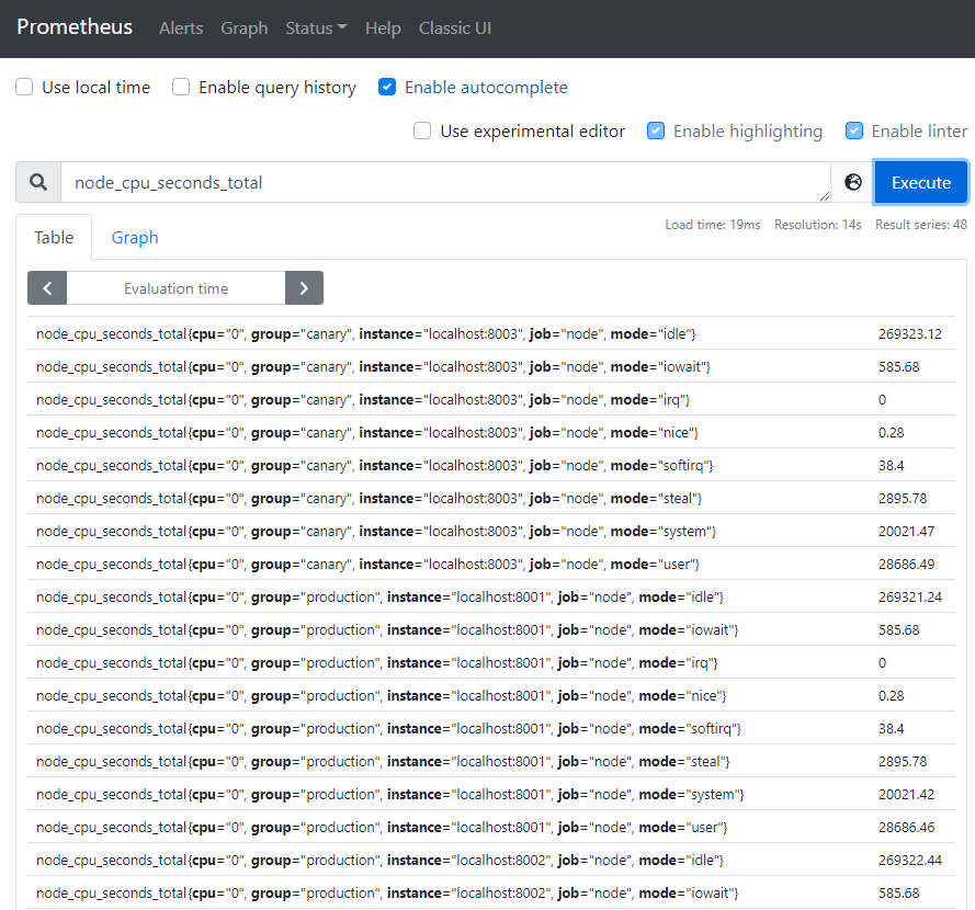 现在,我们将配置 Prometheus 来采样这些新目标。 让我们将所有三个 endpoint 分组为一个称为 “node” 的 job。 但是,假设前两个 endpoint 是生产目标,而第三个 endpoint 代表金丝雀实例。 为了在 Prometheus 中对此建模,我们可以将多个端组添加到单个 job 中,并为每个目标组添加额外的标签。 在此示例中,我们将 group=“ production”