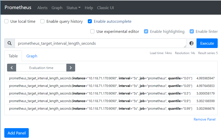 页面内容可知,Prometheus 导出了关于其自身的一个名为 prometheus_target_interval_length_seconds