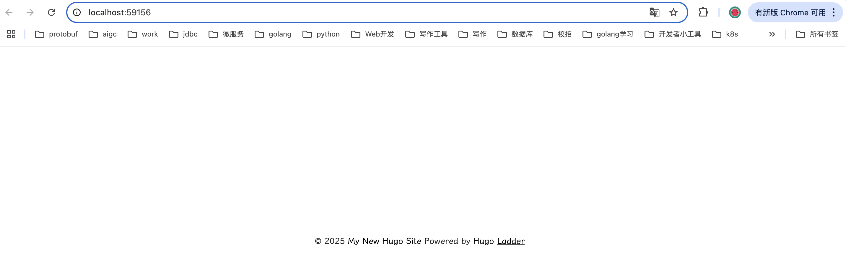 接着会在默认的 1313 端口启动 hugo 的站点(我本地的1313被占用了,则随机分配了另一端口),当前站点内没有任何的内容。