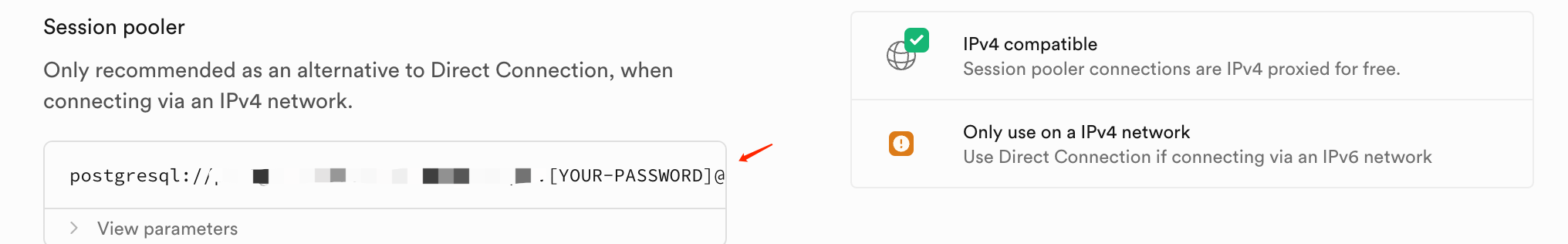 记录下这里通过 Session pooler 接入数据库的方式(DATABASE_URL),下文 Umami 接入 DB 时注意替换密码为你创建的密码。
