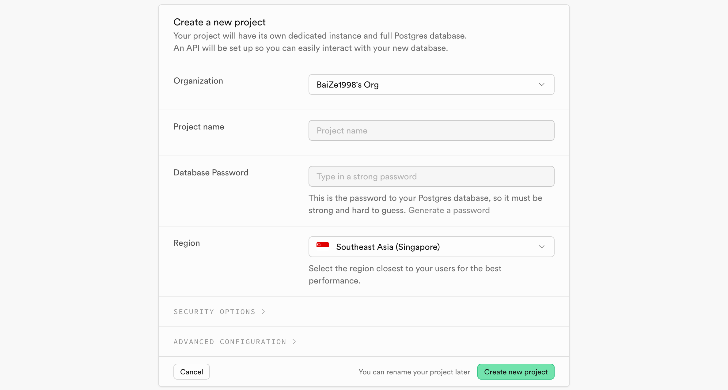 数据库用的是 supabase 提供的有限额的 postgres 数据库,创建一个 supabase 账号,新建一个项目,输入 Datebase password 即可创建数据库服务。