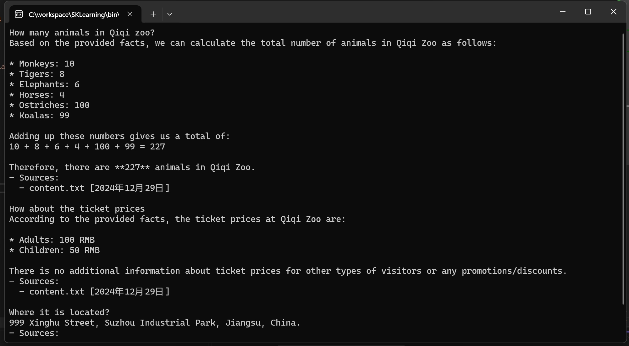 以下代码我们指示了使用 ollama 来进行文本生成跟文本 embedding 生成。同时指定了使用一个简易的内存数据库来存储跟检索向量。然后把 Qiqi zoo 的文本内容导入进去,之后就可以问相关的问题了。