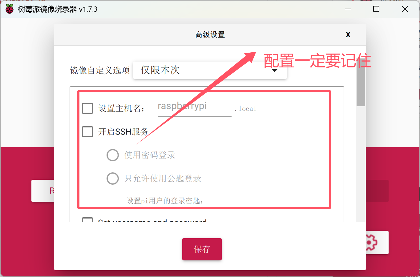 - 配置镜像网络和ssh配置,点击配置选项按钮,然后进入配置页面,并且记住自己的配置。
