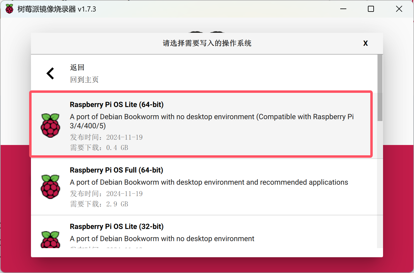 - 由于我用的是树莓派Zero 2W配置比较低,所以我采用安装的是无图形界面的版本。