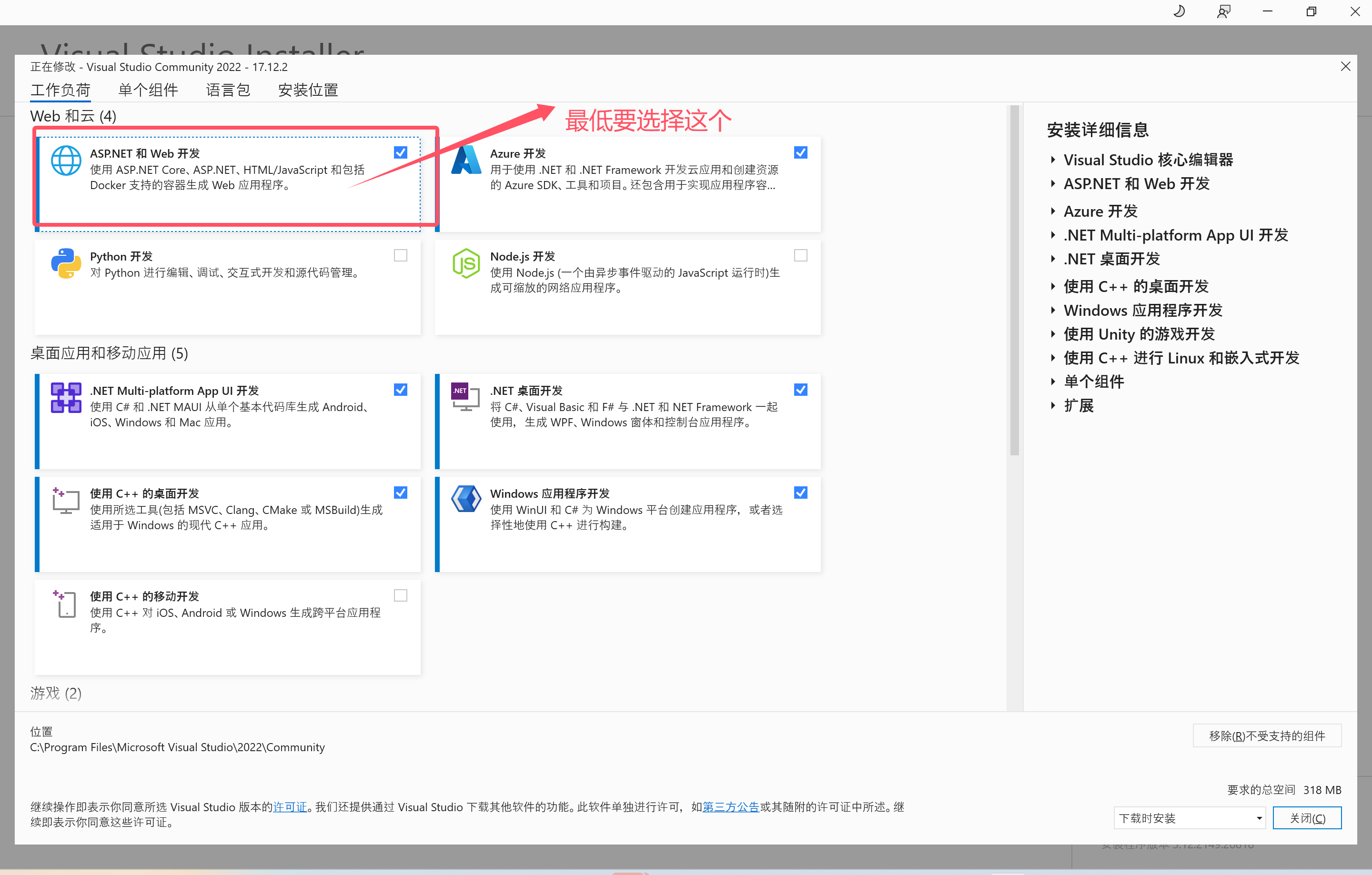- 首先安装Visual Studio,下载最新的社区版本就行,安装对应的负载,和对应的.NET版本。