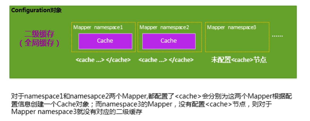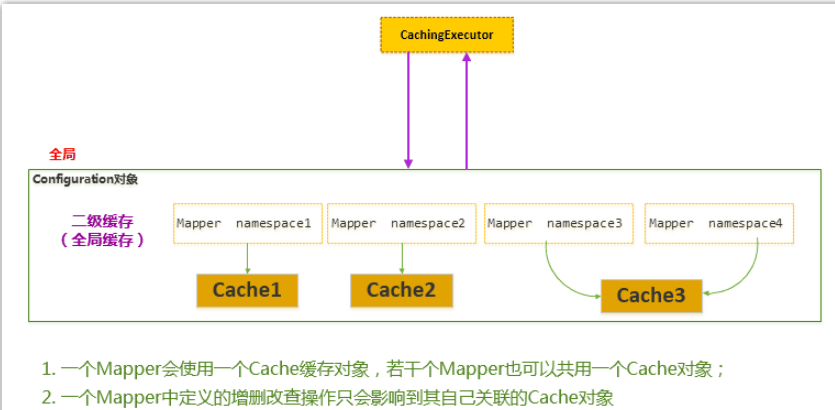 注:上述的每一个Cache对象,都会有一个自己所属的namespace命名空间,并且会将Mapper的 namespace作为它们的ID;