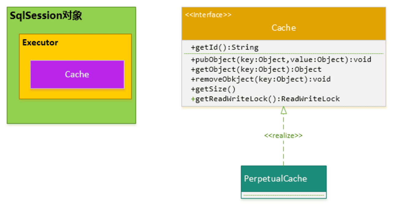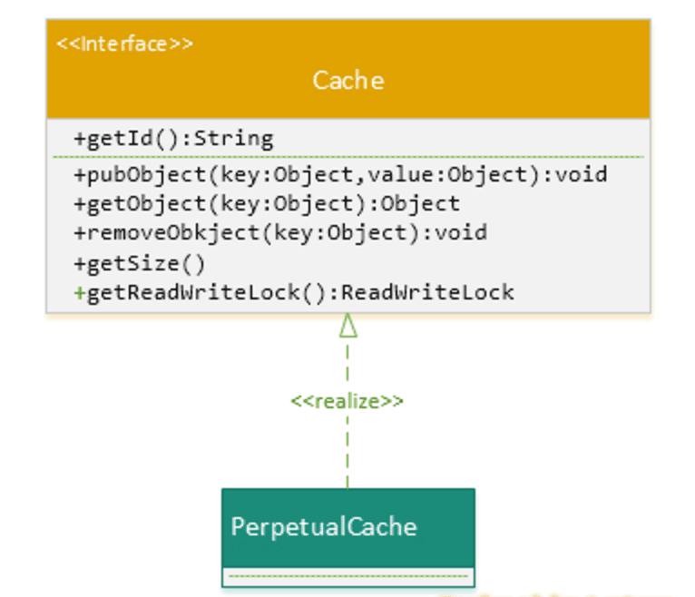 如下图所示,MyBatis定义了一个org.apache.ibatis.cache.Cache接口作为其Cache提供者的SPI(Service Provider Interface) ,所有的MyBatis内部的Cache缓存,都应该实现这一接口。MyBatis定义了一个PerpetualCache实现类实现了Cache接口,实际上,在SqlSession对象里的Executor对象内维护的Cache类型实例对象,就是PerpetualCache子类创建的。
