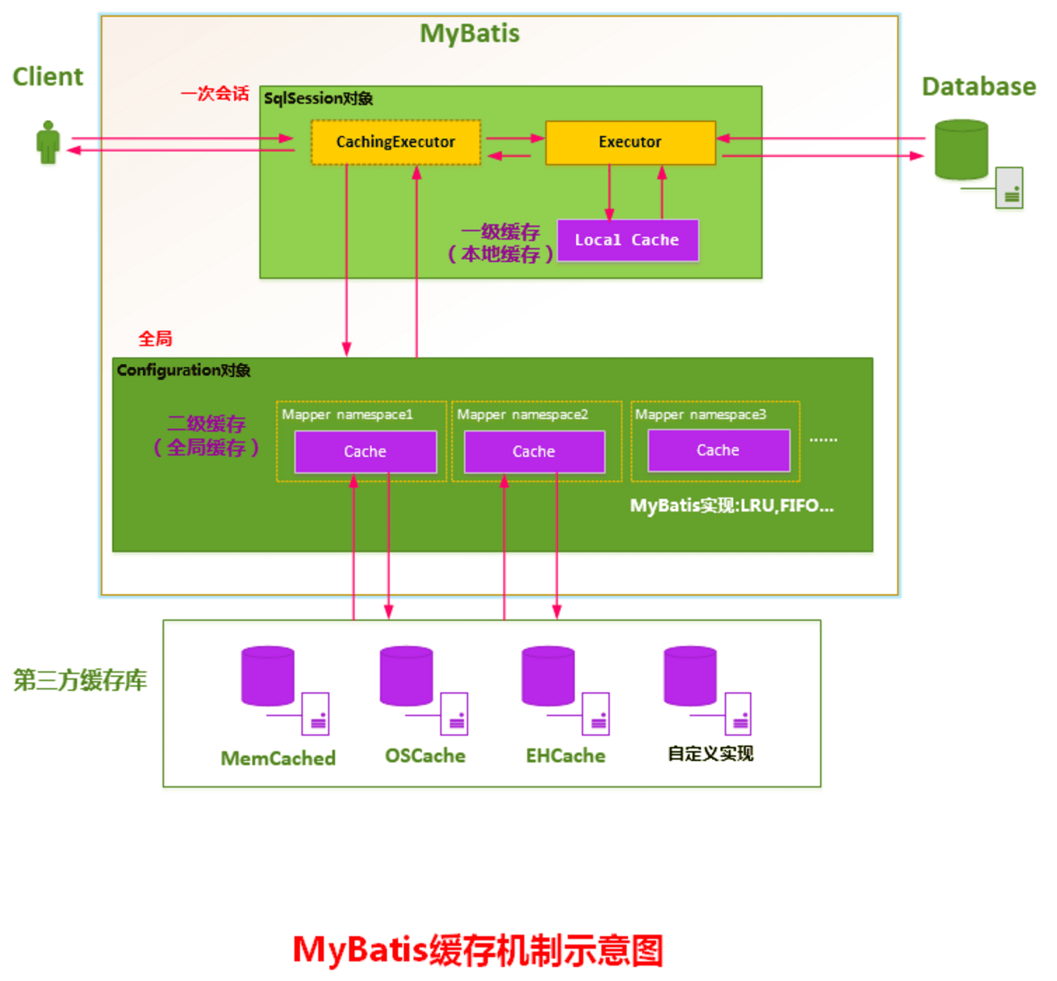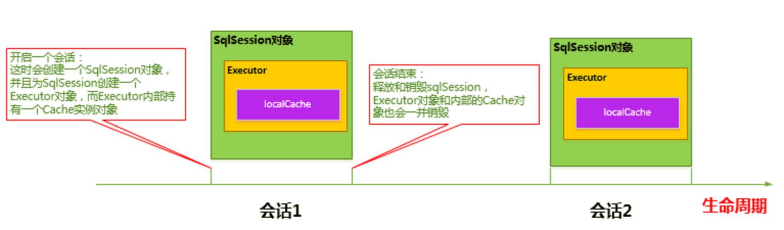 MyBatis在开启一个数据库会话时,会创建一个新的SqlSession对象,SqlSession对象中会有一个新的Executor对象,Executor对象中持有一个新的PerpetualCache对象;当会话结束时,SqlSession对象及其内部的Executor对象还有PerpetualCache对象也一并释放掉。