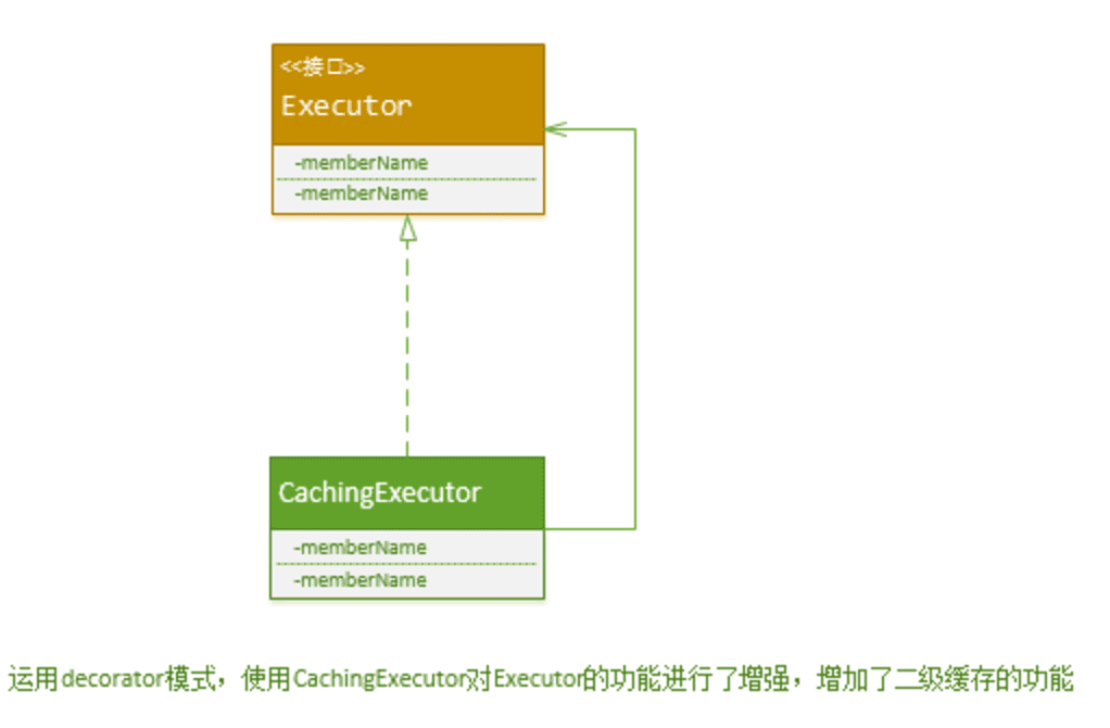 CachingExecutor是Executor的装饰者,以增强Executor的功能,使其具有缓存查询的功能,这里用到了设计模式中的装饰者模式,CachingExecutor和Executor的接口的关系如下类图所示: