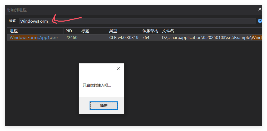 到这里,可能有些人要说,dnspy 启动 exe 的方式因为各种原因在我们这边行不通,有没有其他的方式呢? 当然是有的,我们还可以在程序启动之后以 进程附加