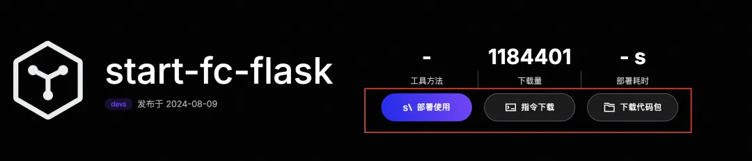 应用模版详情页,支持三种使用方式:云端部署(s\部署使用)、指令下载、下载代码包。