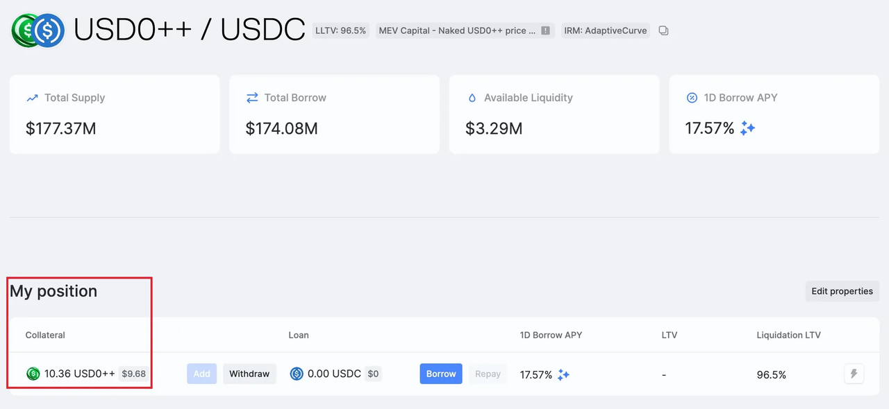 在 Morpho 上的 USD0++ / USDC 市场提供了 10.36 USD0++ 作为抵押品。