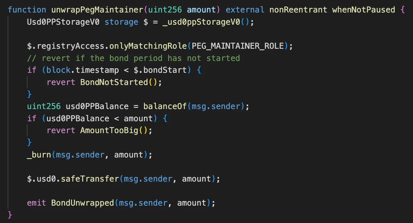 Usd0PP 合约的特权函数,权限地址可以通过这个函数在锁定期内将 USD0++ 按照 1:1 兑换成 USD0。