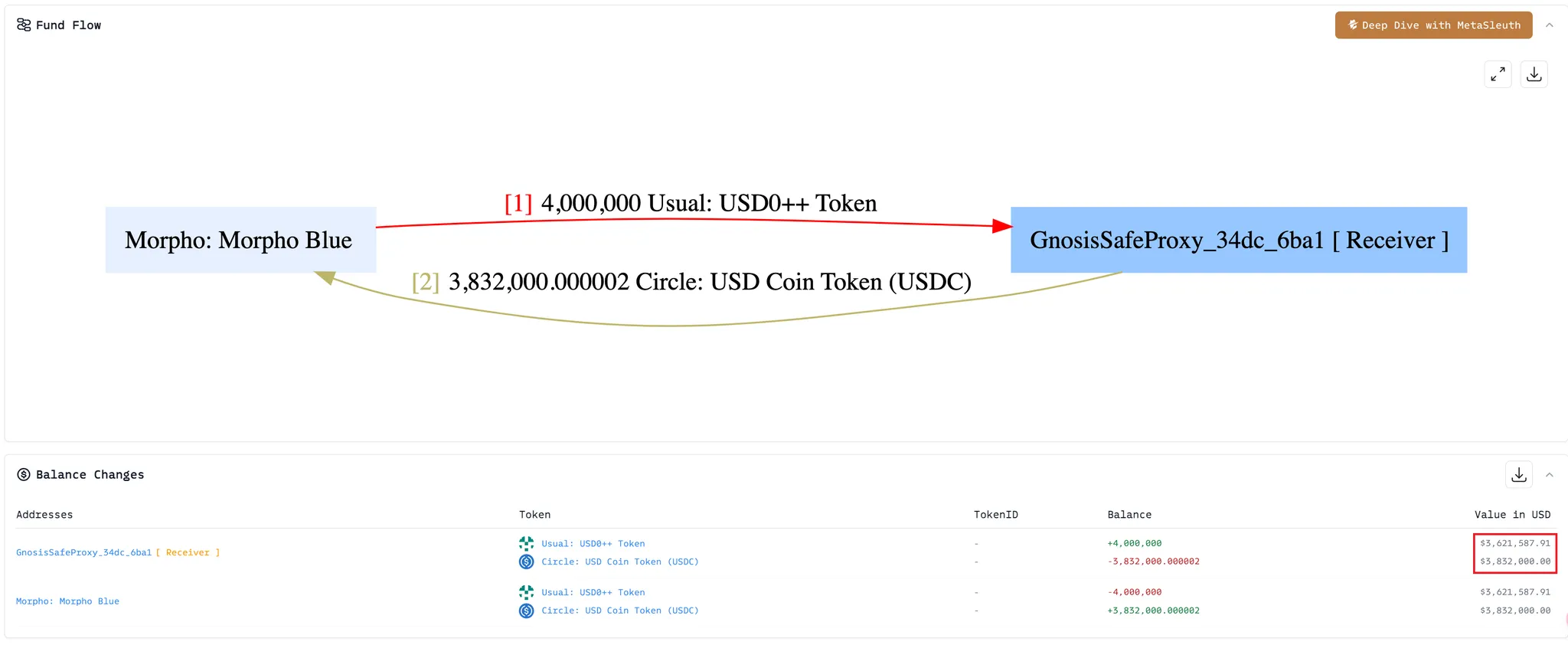 项目方用价值 3832000 U 的 USDC 换回来了价值 3621587 U 的 4000000 USD0++,妥妥的清算了一笔坏账。